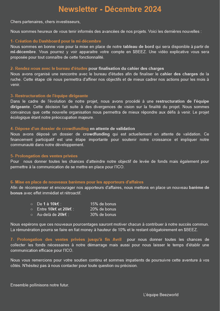 Mise à jour du projet BeezWorld. Fin de la prévente du $BEEZ le 9 février 2025 et début de l'ICO le 10 février 2025.